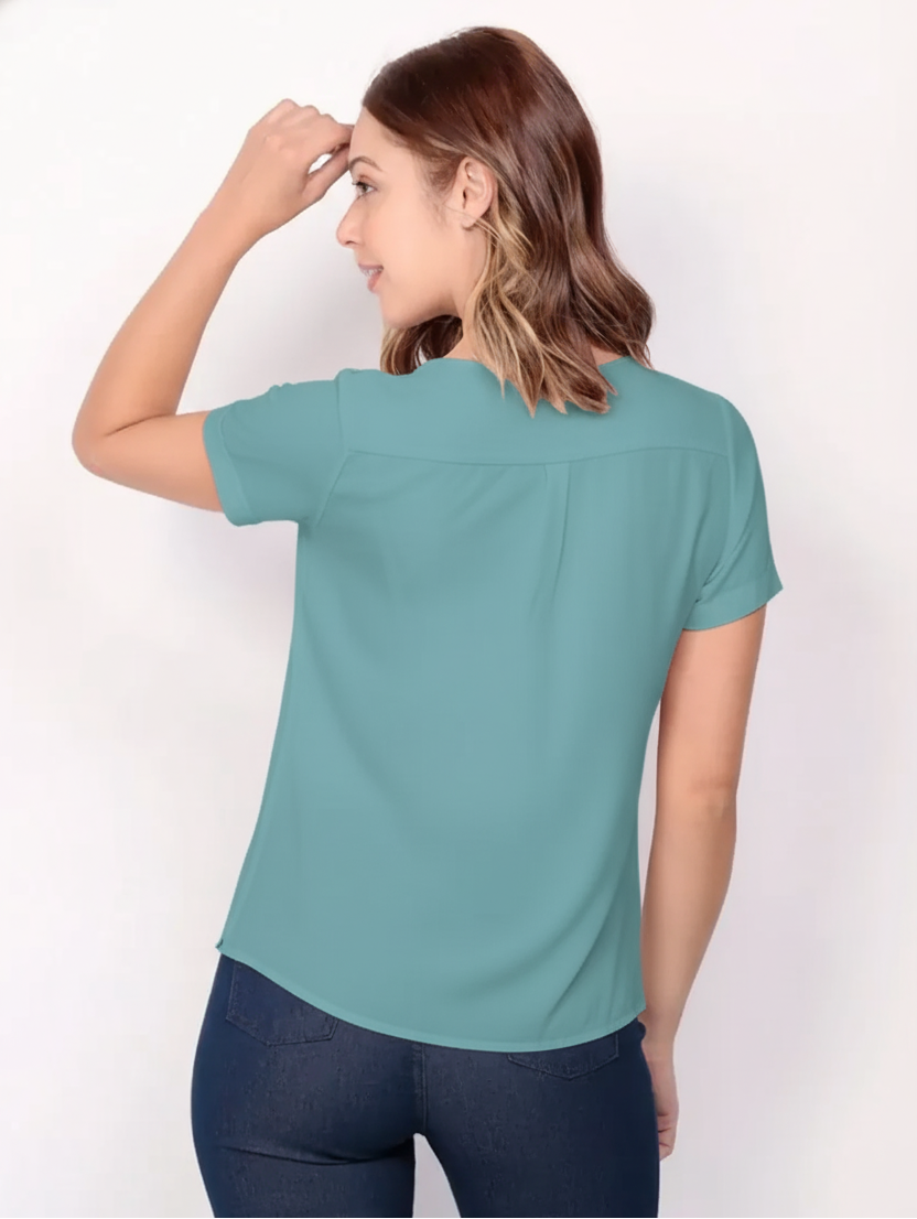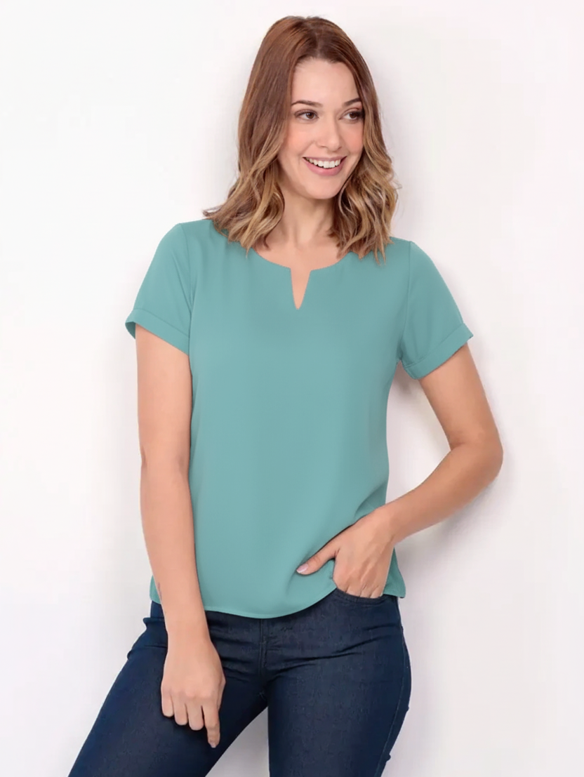 Blusa feminina, manga curta, com decote na frente e abertura nas laterais.