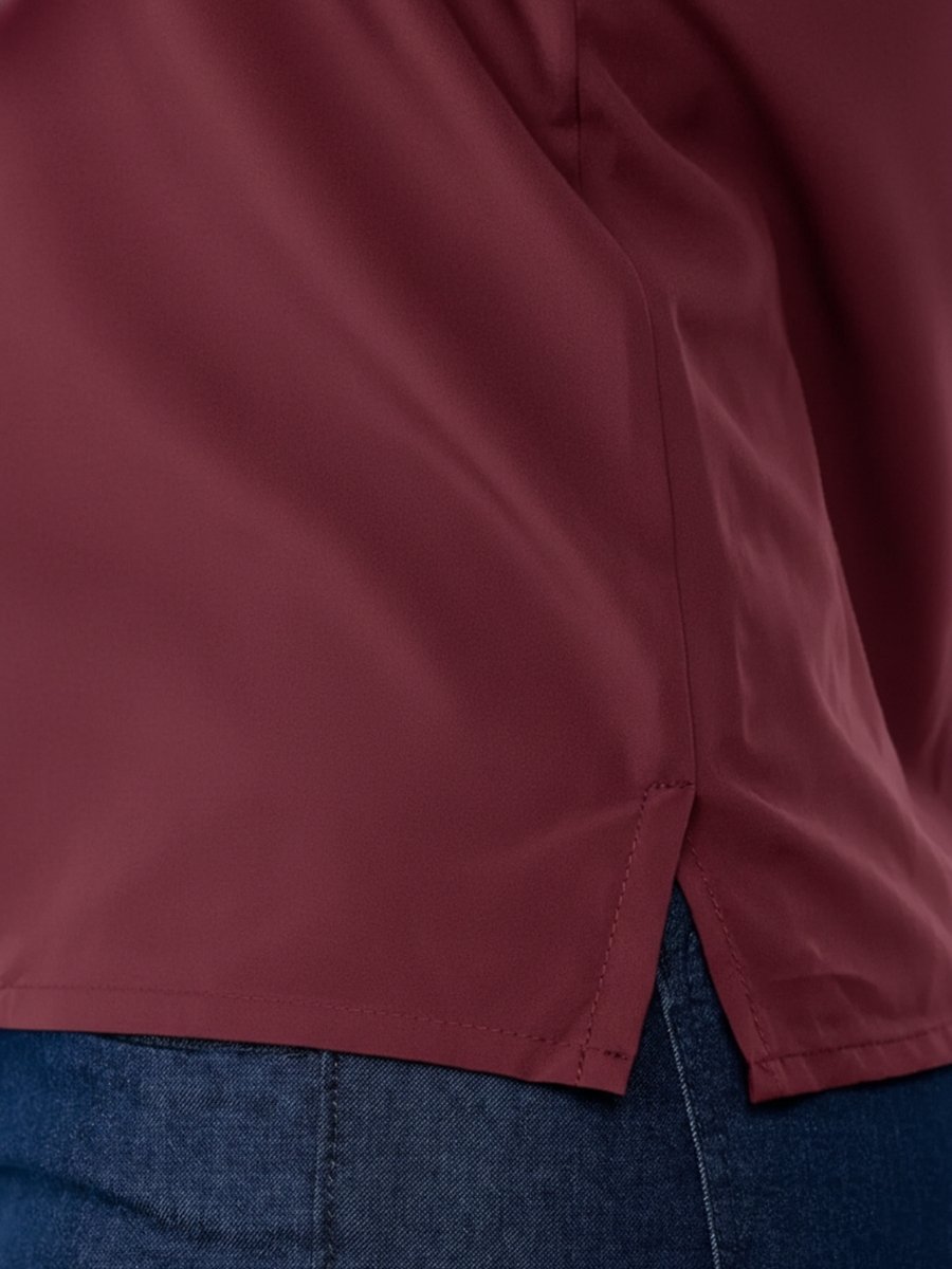 Camisa feminina, manga curta, gola laço, abertura nas laterais. Toque ultra suave.