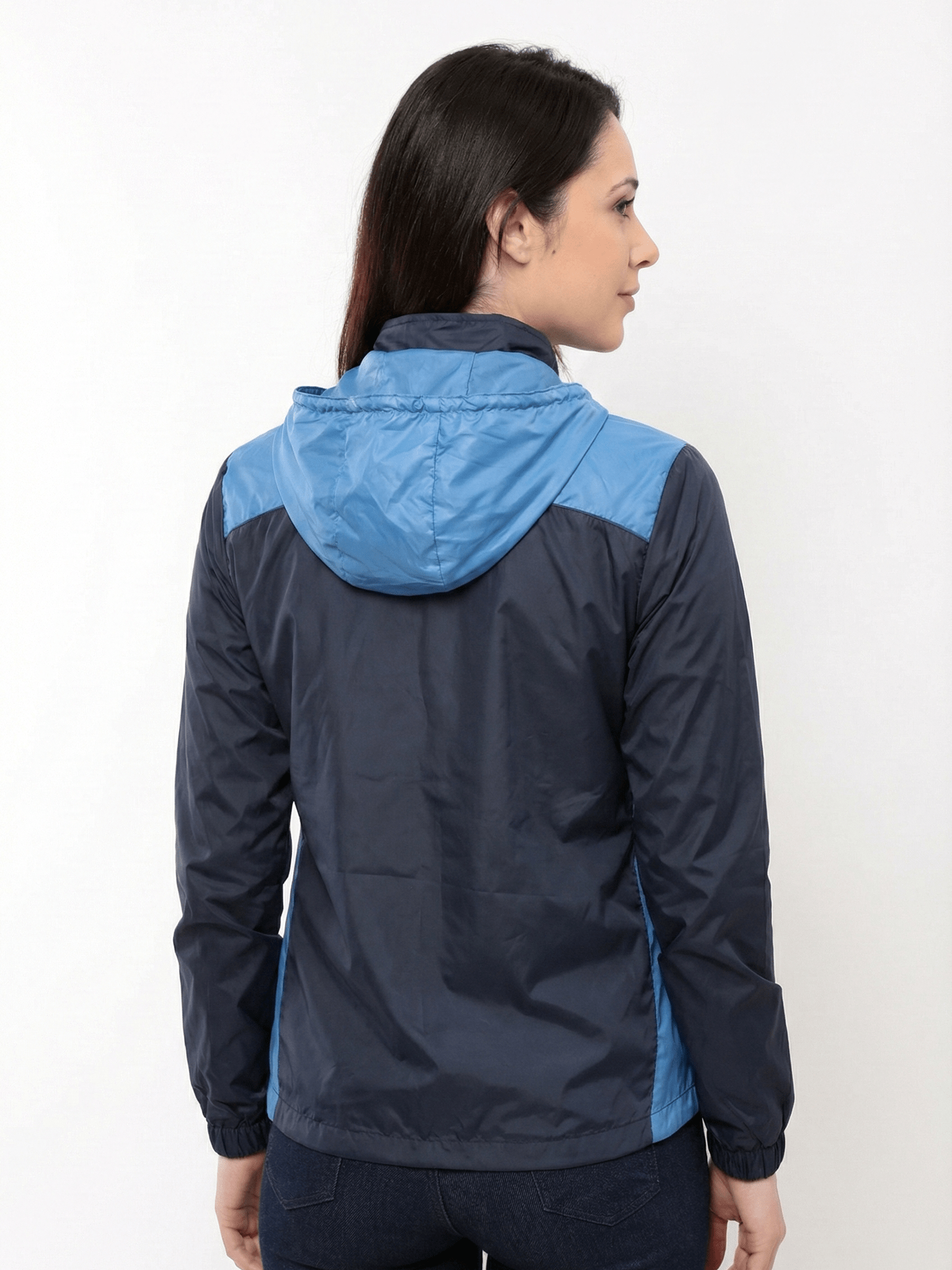 Jaqueta feminina corta vento, com capuz removível, recorte colorido, bolso na lateral, elástico na manga.