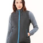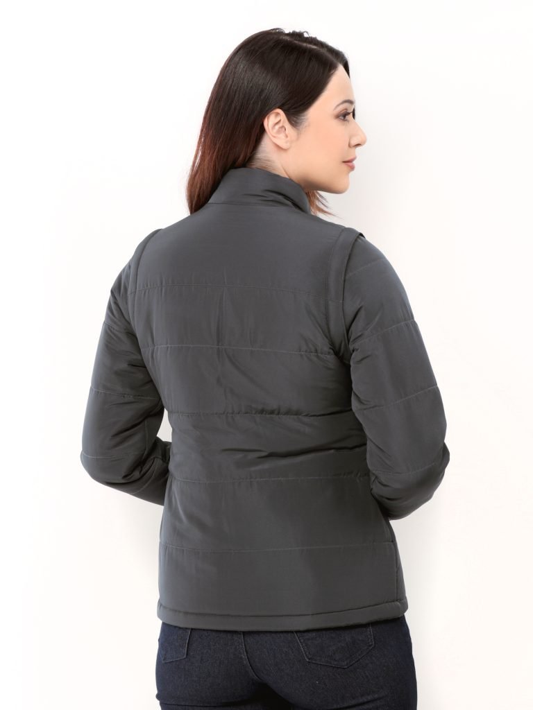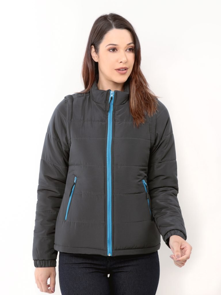 Jaqueta de gomos feminina vira colete, com zíper colorido nos bolsos e na frente.