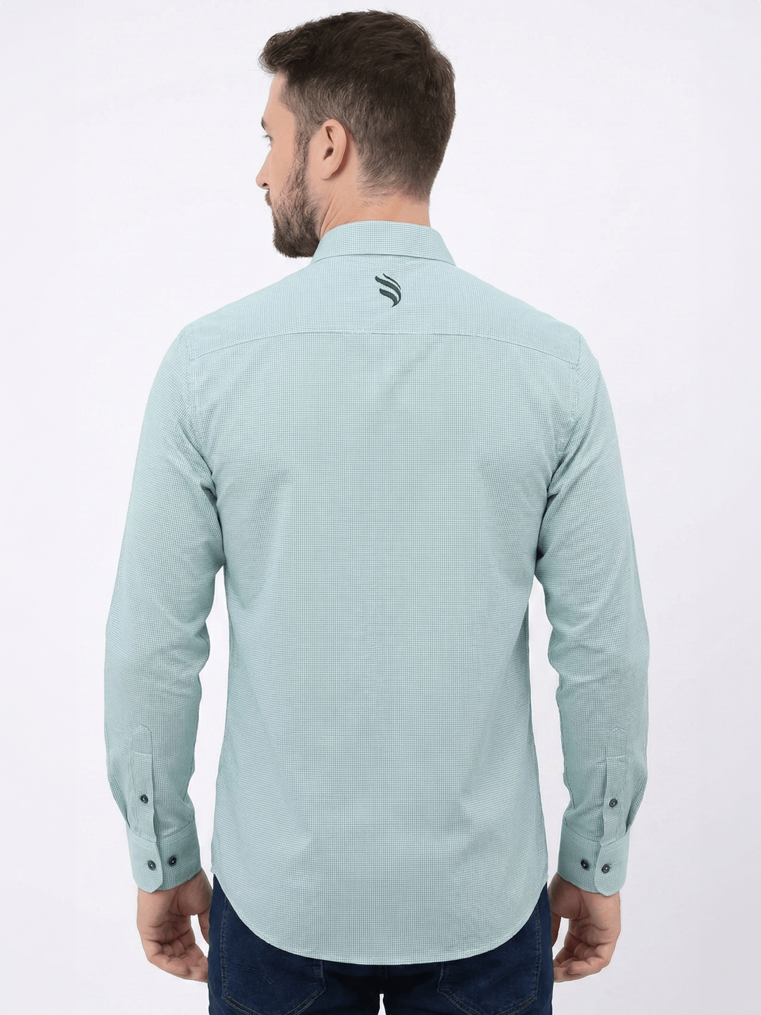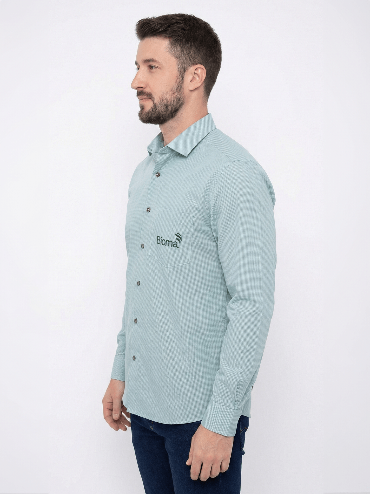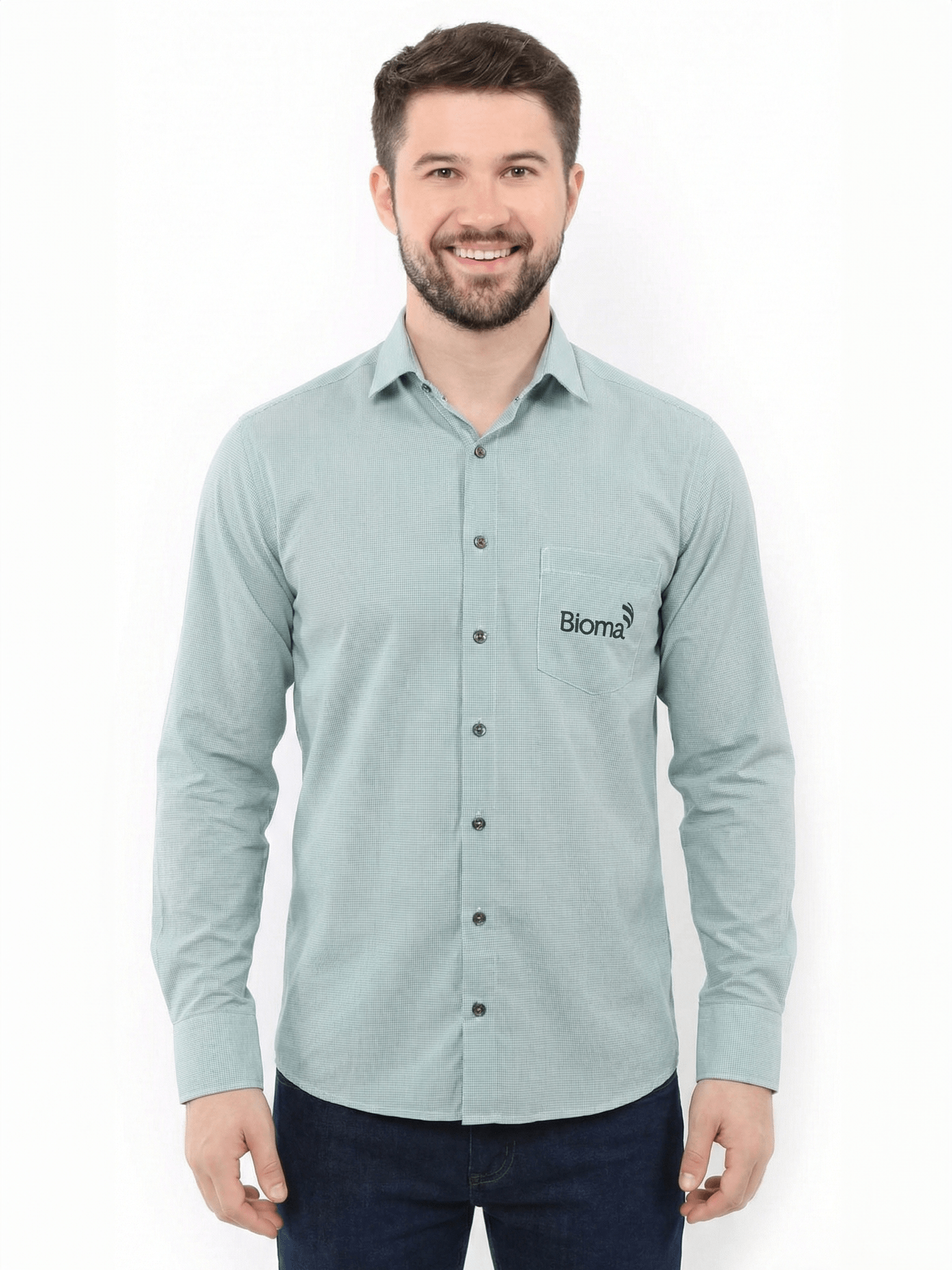 Camisa tradicional masculina, manga longa, sem detalhes.