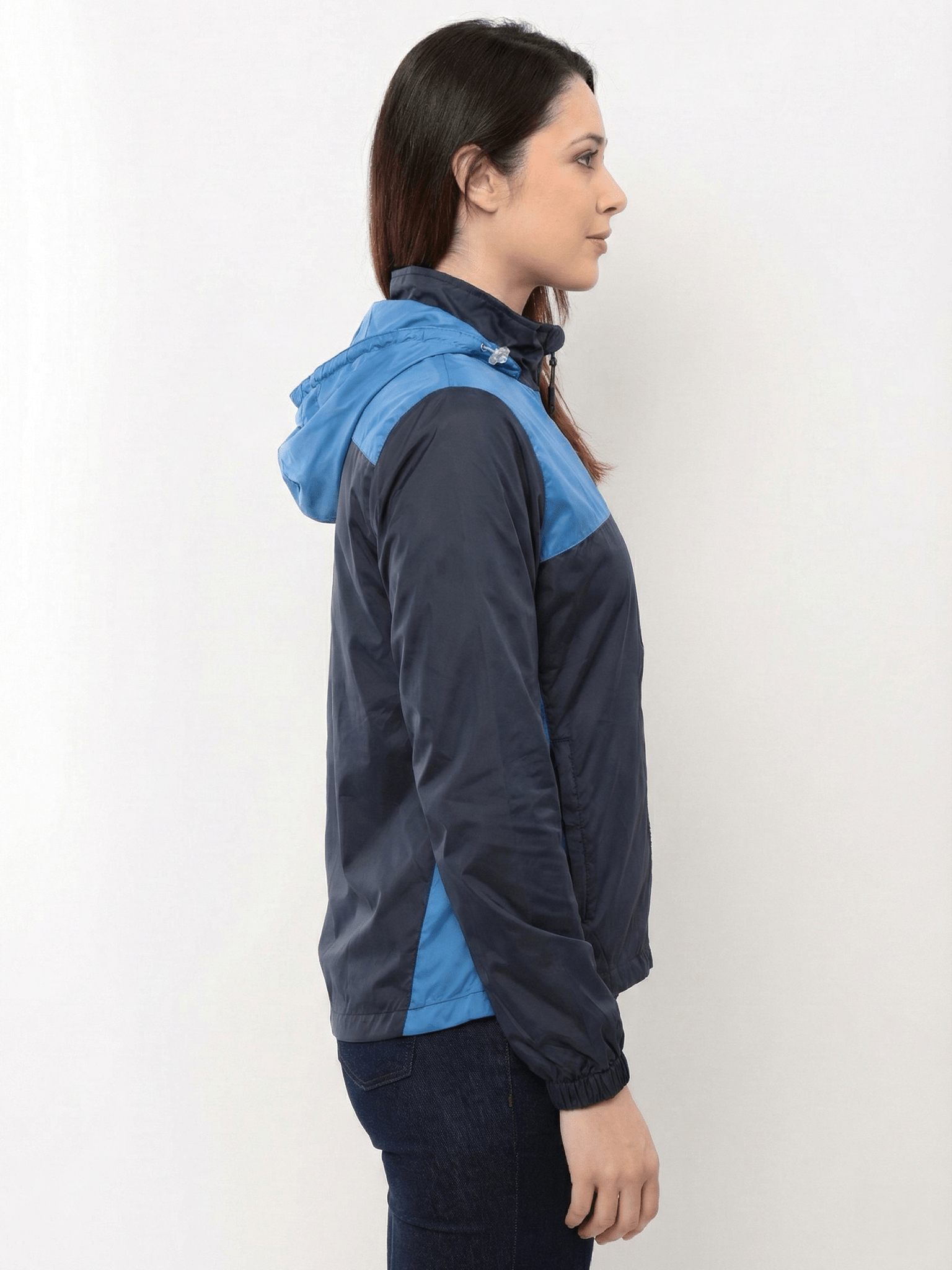 Jaqueta feminina corta vento, com capuz removível, recorte colorido, bolso na lateral, elástico na manga.