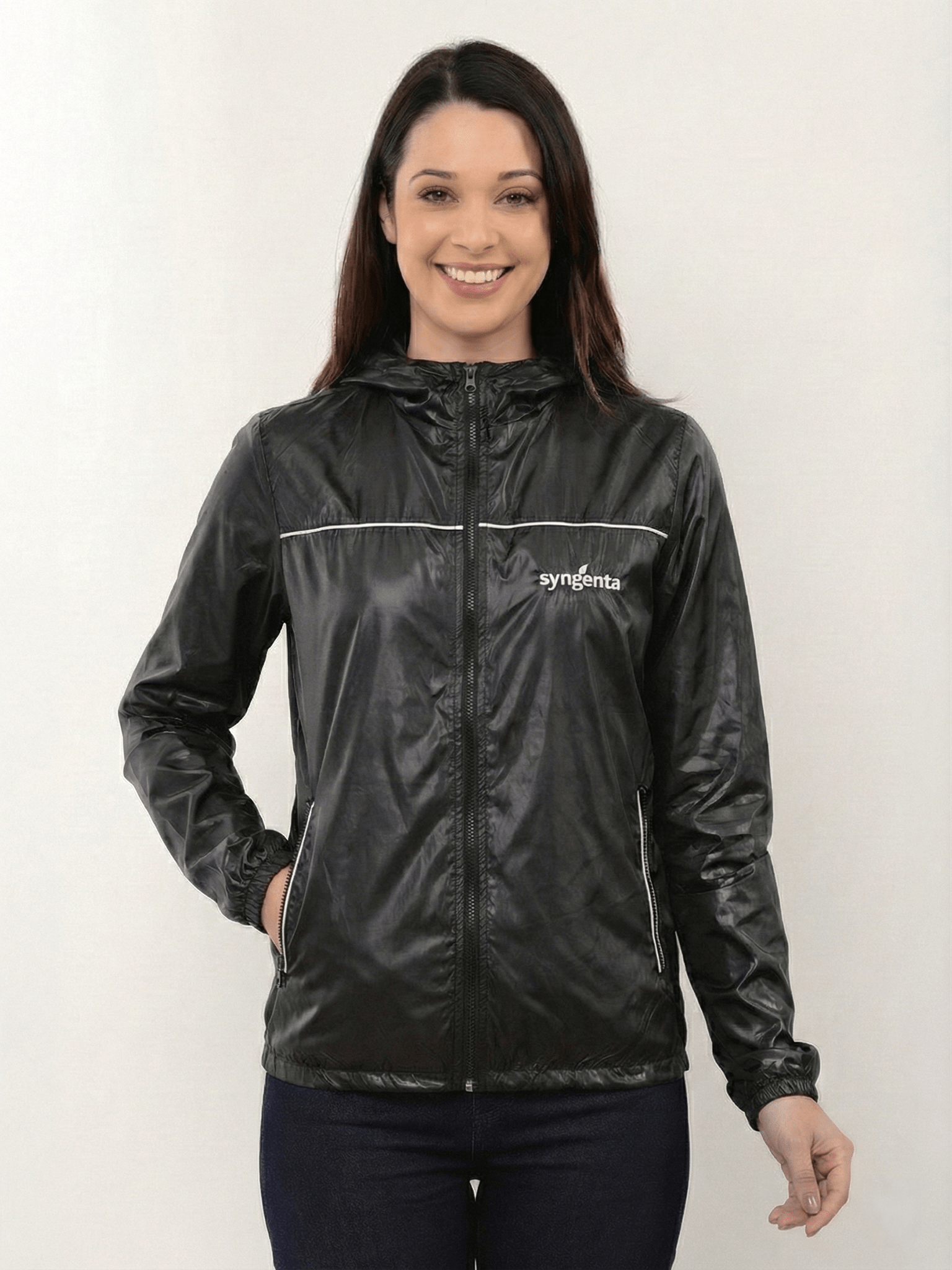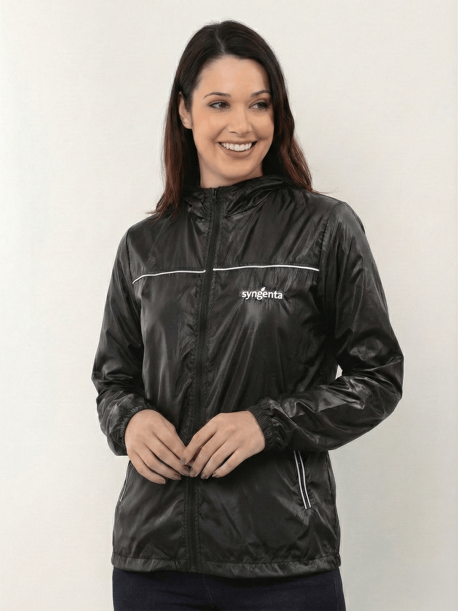 Jaqueta feminina leve com detalhe de viés colorido e capuz