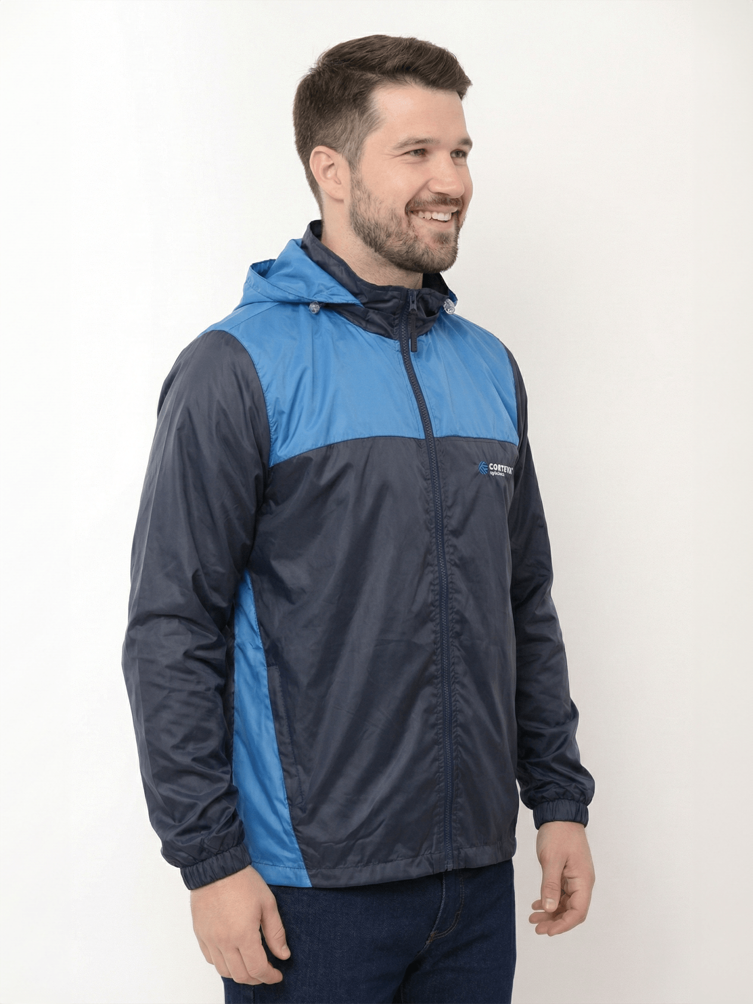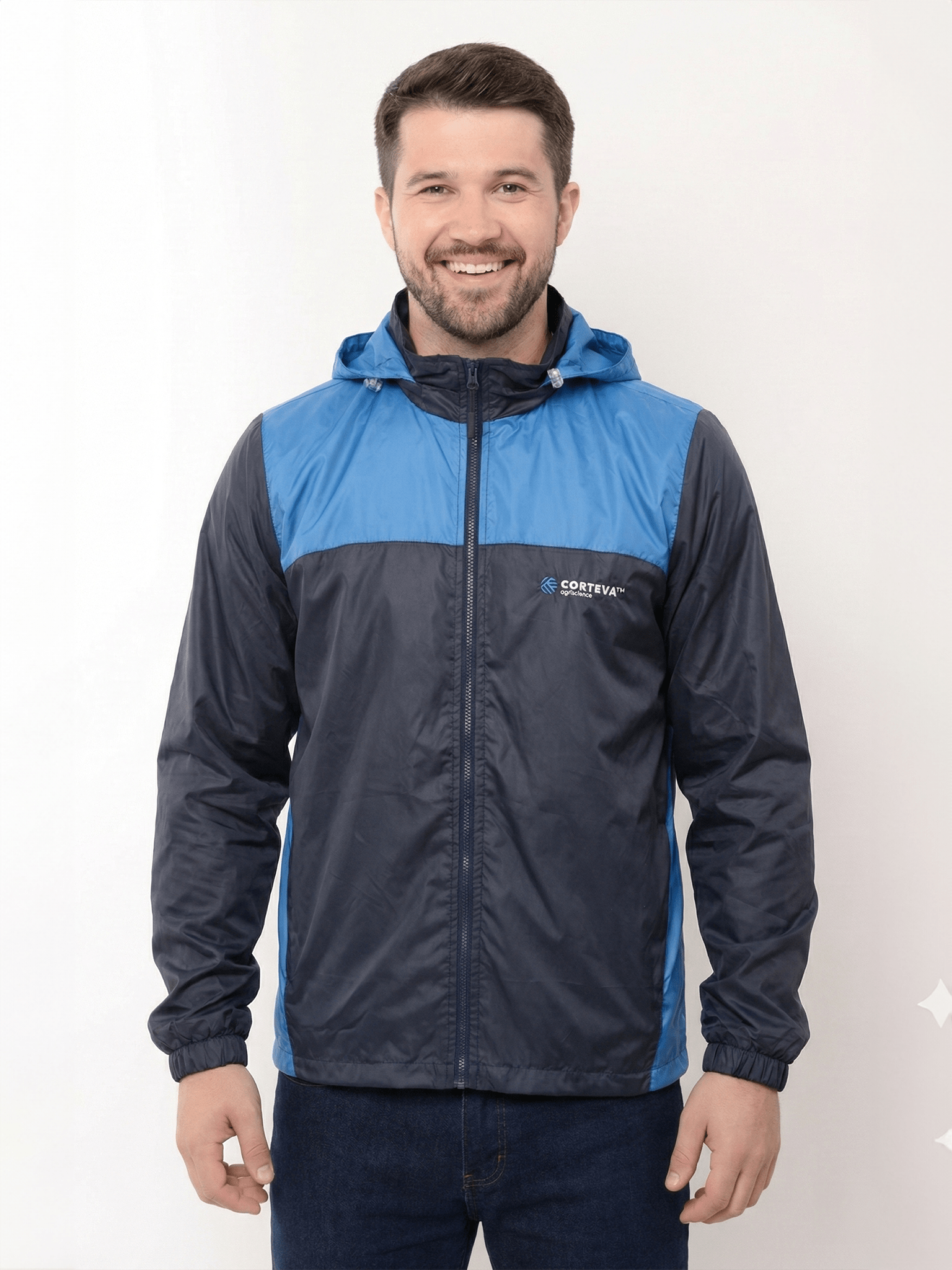 Jaqueta masculina corta vento, com capuz removível, recorte colorido, bolso na lateral, elástico na manga.