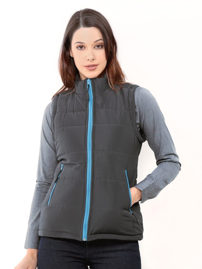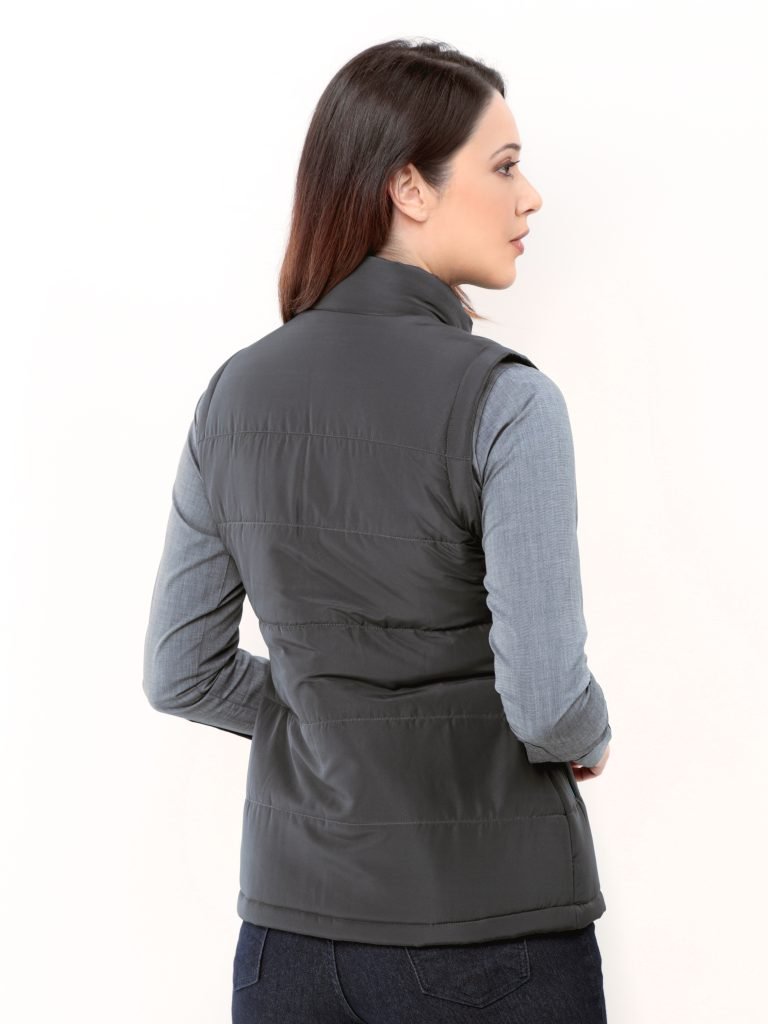 Jaqueta de gomos feminina vira colete, com zíper colorido nos bolsos e na frente.